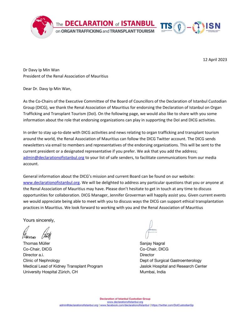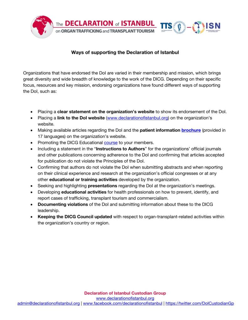 The Renal Association is an endorsing organisation of The Declaration of Istanbul
