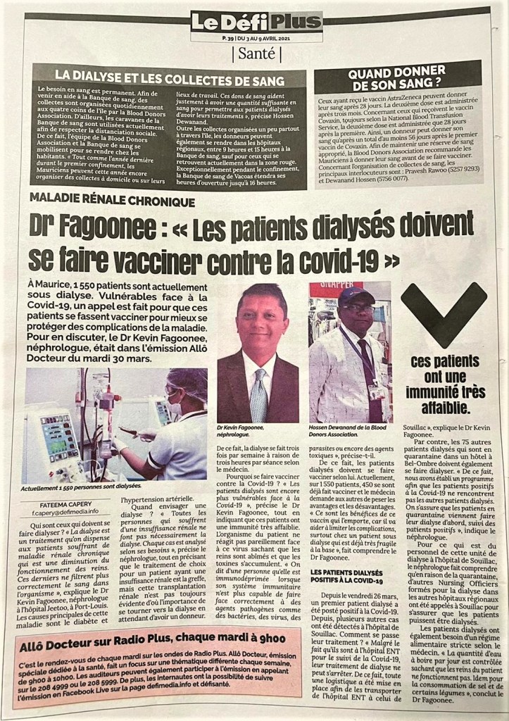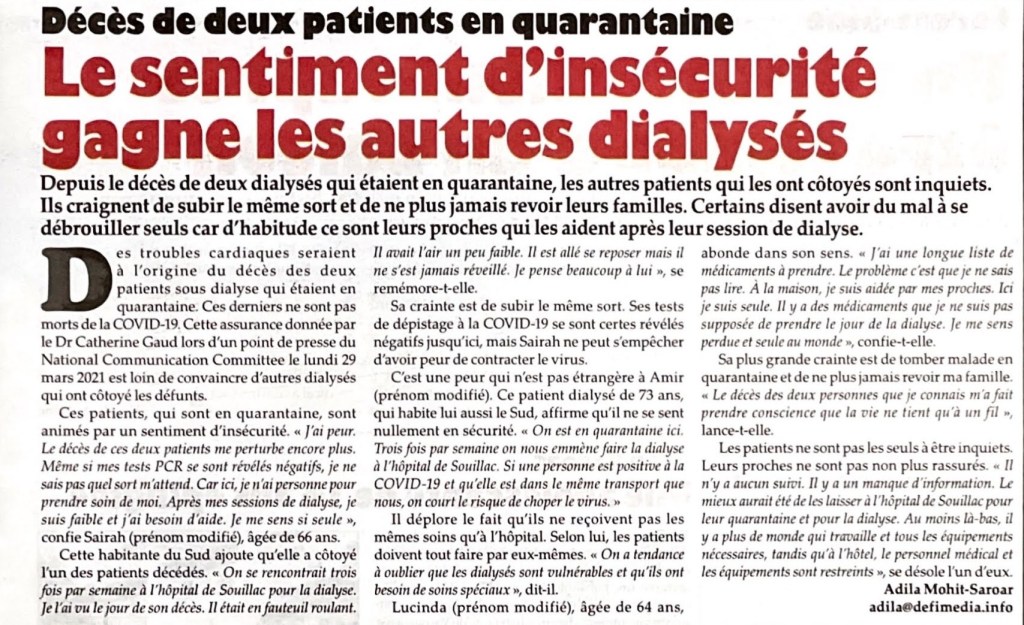 Le Défi 19 April 2021 Patients dialysés: la distanciation physique inexistante dans les transports